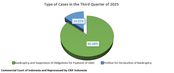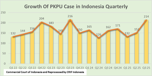 Data from the Case Tracking Information System (SIPP) shows that PKPU cases rose sharply to 214 cases in Q3 2025, up from 152 cases in the previous quarter. This surge highlights mounting financial pressure experienced by businesses, particularly in capital-intensive industries. The majority of cases (approximately 86%) involved suspension of debt payment obligations, with the remainder being bankruptcy petitions.
