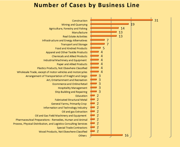 Construction dominates with 31 cases, followed by Mining and Quarrying (19 cases), Agriculture/Forestry/Fishing (14), and both Manufacturing and Real Estate (13 each). Other sectors show smaller but still meaningful numbers.