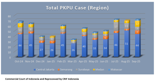 Data across five major regions, Central Jakarta, Semarang, Surabaya, Medan, and Makassar, shows fluctuating PKPU cases.