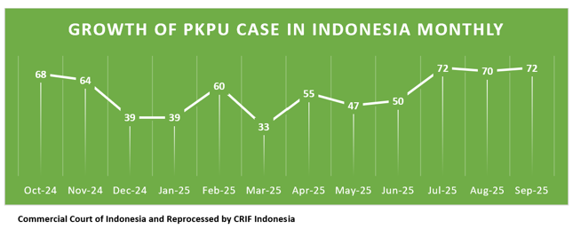 The chart shows monthly PKPU case trends from October 2024 to September 2025. Although the pattern is somewhat volatile, a sharp spike appears in Q3 (July–September 2025), with 72 cases in July, 70 in August, and 72 in September, the highest levels in the period. This highlights Q3 as the most critical phase for businesses.