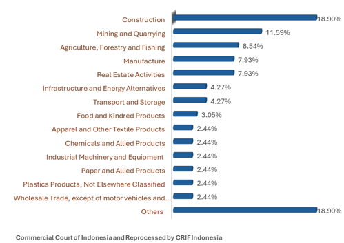 This far exceeds mining (11.59%), agriculture (8.54%), manufacturing (7.93%), and real estate (7.93%). The surge in PKPU cases stems from milestone-based payment structures, prolonged cash conversion cycles, and high leverage. External shocks such as material price fluctuations and La Niña-driven weather disruptions further amplify financial stress. Notably, major state-owned contractors like Waskita Karya and Wijaya Karya faced multiple PKPU filings in 2023–2024, underscoring systemic liquidity vulnerabilities even among large players.